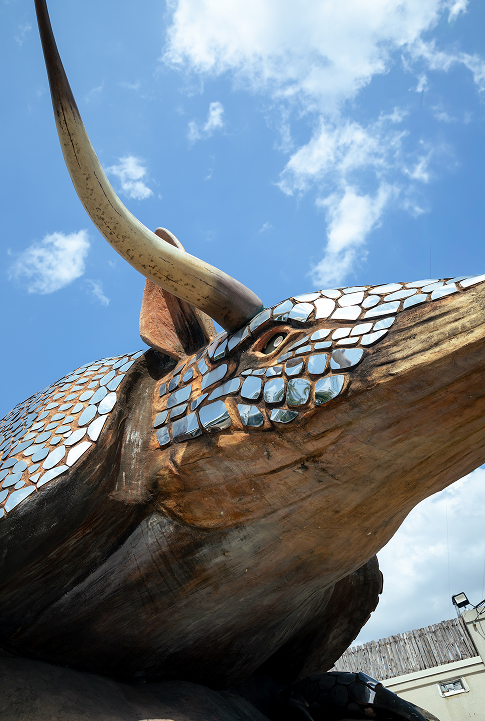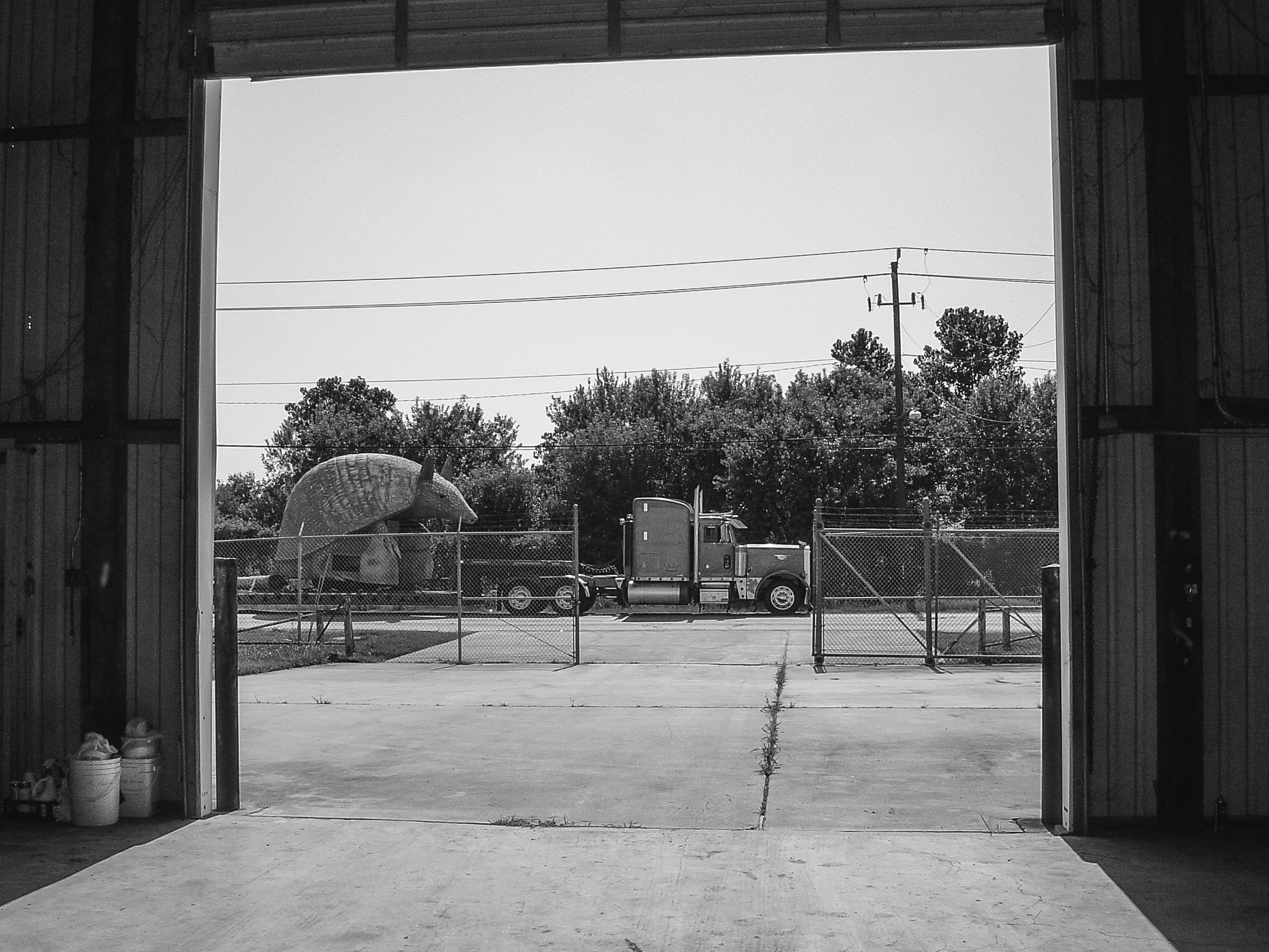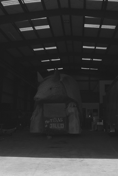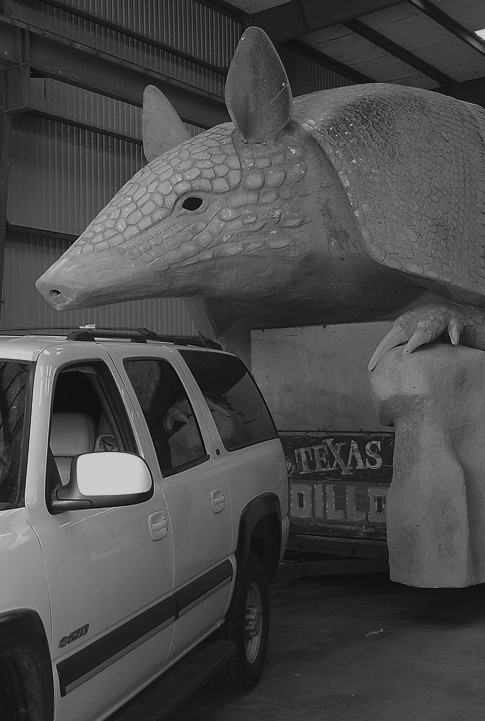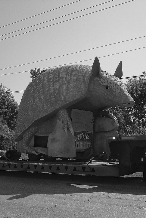 The armadillo was originally hauled in two pieces on two connected trailers—the body on one; the tail on the another, wagging back and forth as it rolled down the interstate.